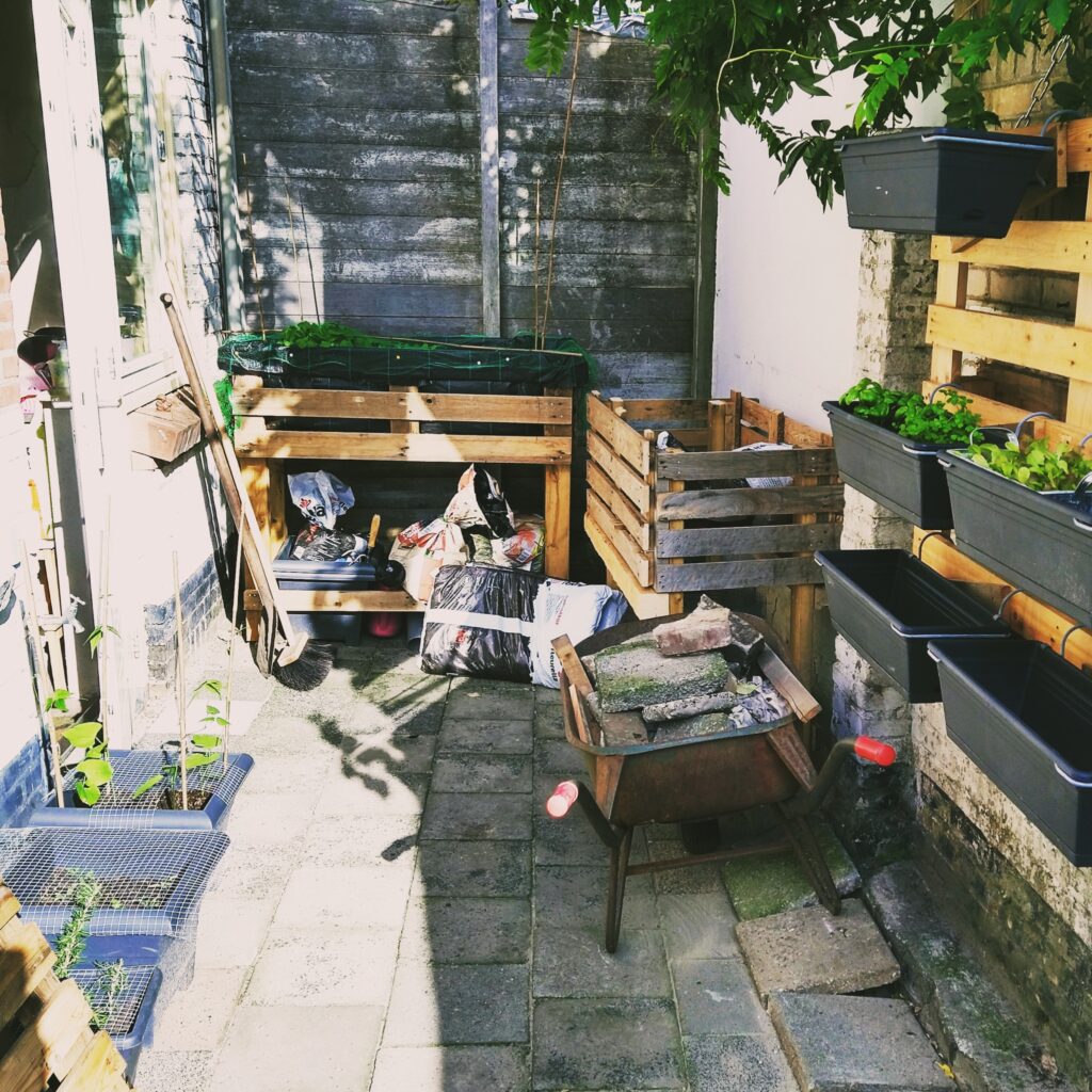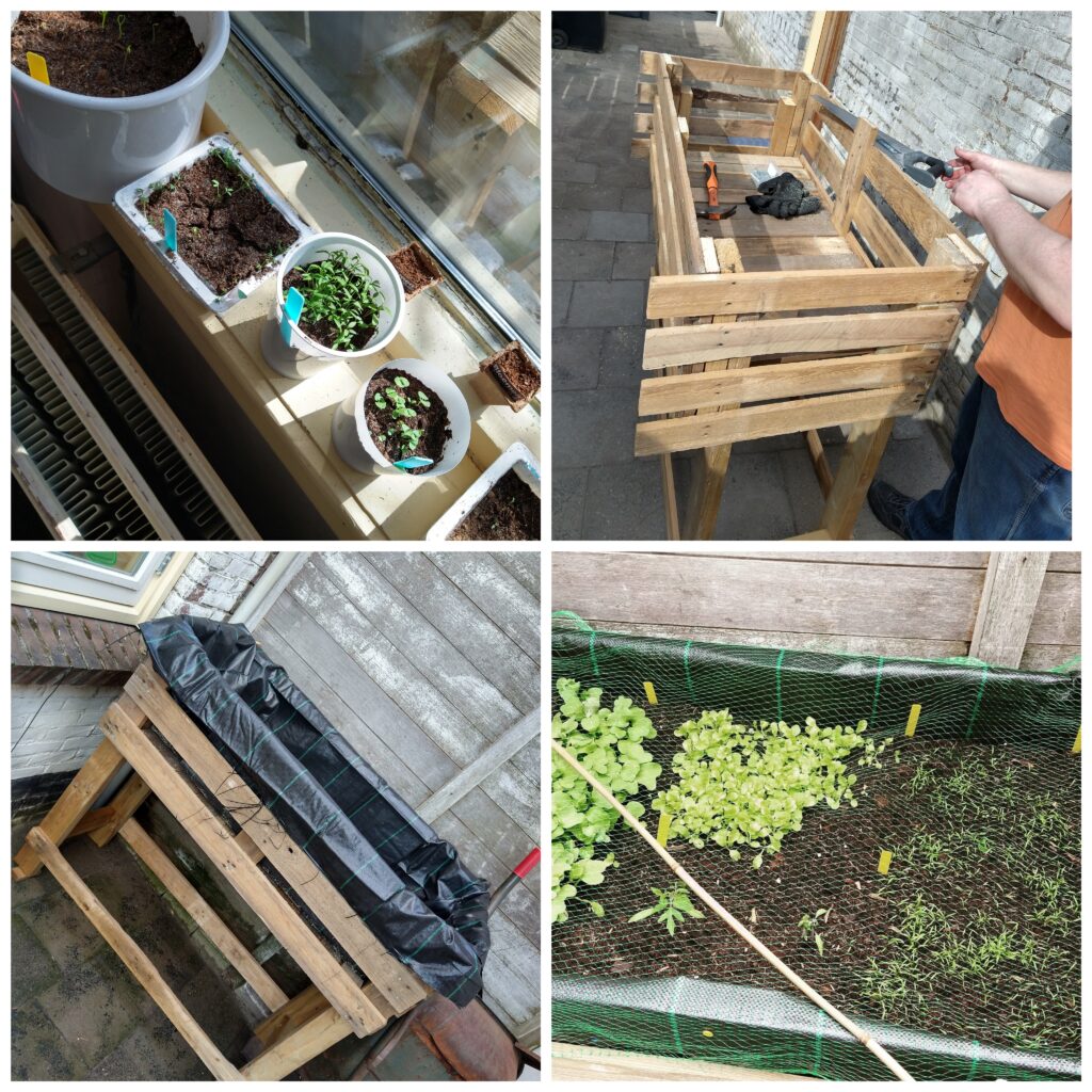 So this year I looked online for free wooden pallets. I needed Johannes his muscles to pick them up and together we turned them into raised garden beds. One pallet we hung on the wall and added balcony planters for my herbs.